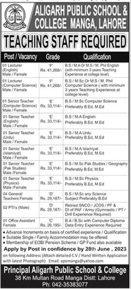 Aligarh Public School and College Manga Lahore Jobs 2023
