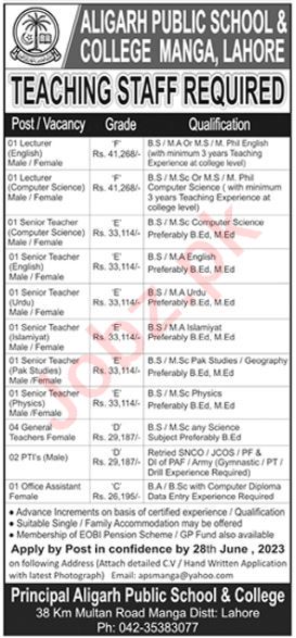 Aligarh Public School And College Manga Lahore Jobs 2023