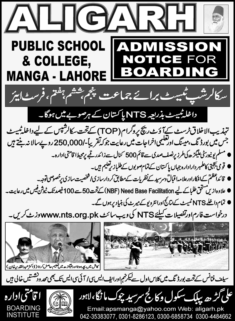 Aligarh Public School & College invites applications for admissions in Class 5th, Class 6th, Class 7 and 1st Year in Manga Lahore Punjab Pakistan 2021. Read newspaper ad for exact details.