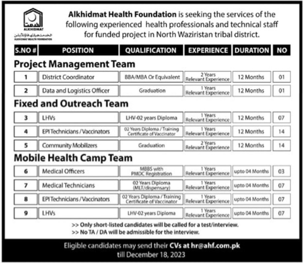 Vacancies in ALKhidmat Health Foundation Advertisement December 2023