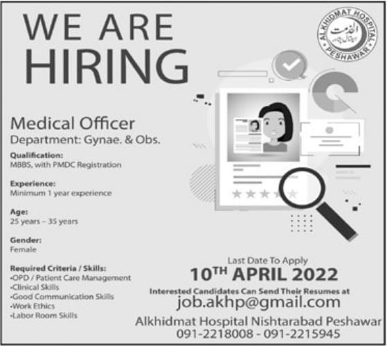 Al Khidmat Hospital jobs advertisement dated about 7 April 2022 in daily Mashriq Newspaper invites application for the vacant post of gynecologist and medical officer in Peshawar, peshawar Khyber Pakhtunkhwa KPK Pakistan. Candidates with Others and MBBS etc. educational background will be preferred.