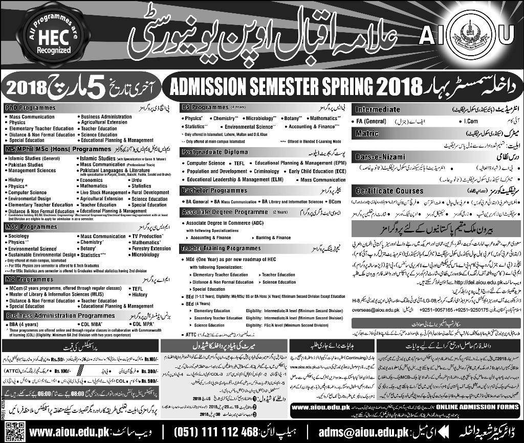 Allama Iqbal Open University Admission, BS, MS Islamic Studies, History, Physics, Computer Sciences, Economics, BA General Sciences, , BBA, MA, MSc and BBA in Islamabad. Read newspaper ad for exact details.