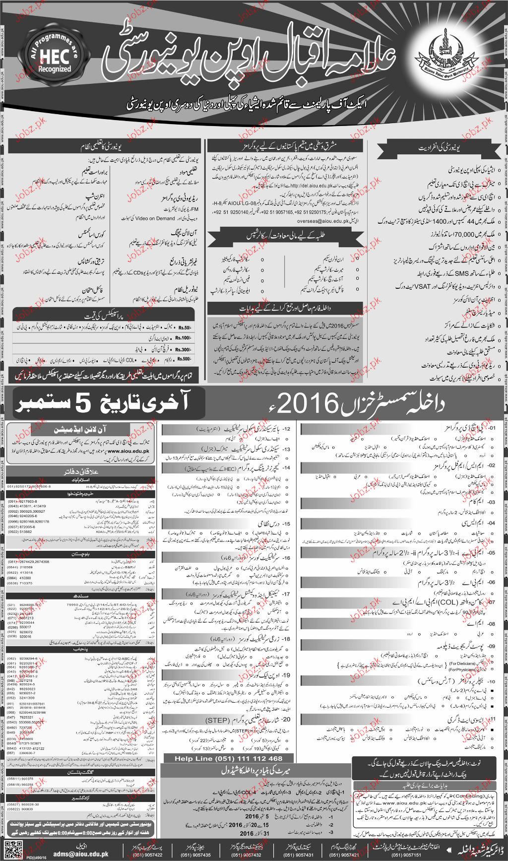 Allama Iqbal Open University Admission in Phd, MA, MA, BA, BSc and Matric in Islamabad. Read newspaper ad for exact details.