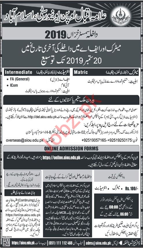 Allama Iqbal Open University AIOU is a Public Sector University has announced admissions for Matric, Intermediate, FA and I-Com in Islamabad Pakistan 2019. Read newspaper ad for exact details.