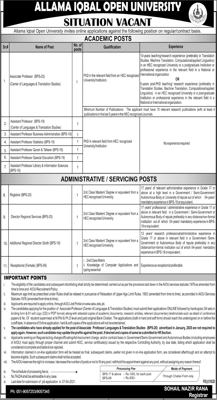 Allama Iqbal Open University AIOU is seeking applications from highly qualified and experienced candidates for the posts of Associate Professor, Assistant Professor, Registrar, Director Regional Service, Additional Regional Director Sindh and Receptionist in Islamabad Pakistan 2021.