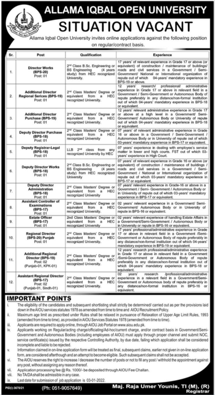 Allama Iqbal Open University AIOU is hiring Director Works, Additional Director Regional Services, Additional Director Purchase, Deputy Director Purchase, Deputy Registrar Legal, Deputy Director Works, Deputy Director Administration, Assistant Controller of Examination, Estate Officer, Regional Director, Additional Regional Director, Assistant Regional Director in Islamabad.