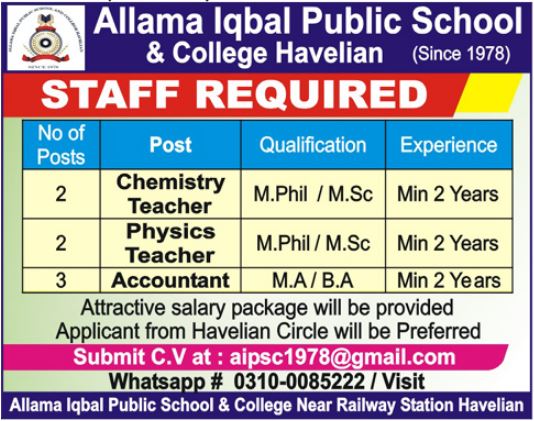 Allama Iqbal Public School And College Havelian Job 2022