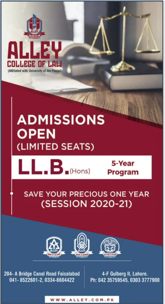 Alley College of Law affiliated with University of The Punjab has announced admissions in Bachelor of Laws LLB Hons 5 Year Program in Faisalabad & Lahore. Read newspaper ad for exact details.