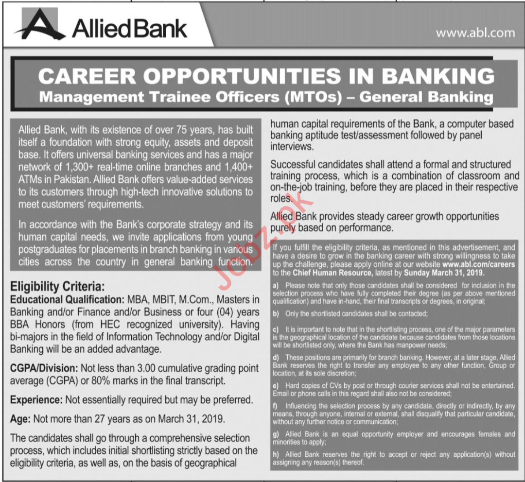 Vacancies in Allied Bank Limited ABL Advertisement March 2019