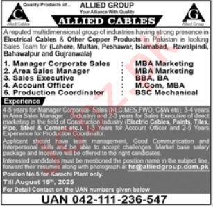 Allied Cables is looking for candidates for following posts as per job advertisement published in daily Jang Newspaper of July 13, 2025 for location Lahore, lahore Punjab Pakistan: