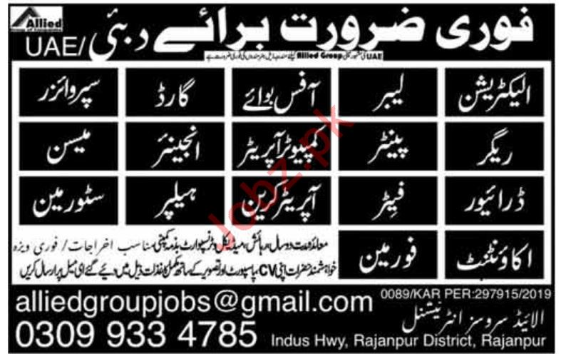 Technical and hardworking personnel for the positions of Electrician, Labor, Office Boy, Security Guard, Supervisor, Rigger, Painter, Computer Operator, Engineer, Mason, Driver, Fitter, Crane Operator, Helper, Accountant, Foreman required for a well known Allied Group in Dubai UAE 2019.