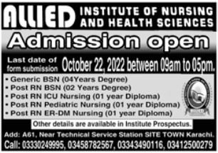 Allied Institute Of Nursing & Health Sciences has announced admissions 2022 for Genetic BSN 4 Years Degree, Post RN BSN 2 Years Degree, ICU Nursing 1 Year Diploma, Pediatric Nursing 1 Year Diploma, Nursing 1 Year Diploma.. Allied Institute Of Nursing & Health Sciences Karachi Sindh Pakistan welcomes students to apply for admissions in academic year 2022 in Medical Diploma. Students for admissions in Diploma, Course and BSN can apply for online or campus classes as per Private institute criteria till admission closing date October 22, 2022. Read newspaper ad for exact details.