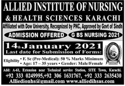 Allied Institute Of Nursing & Health Sciences affiliated with Dow University Recognized By PNC Approved By Government of Sindh is offering admissions in Generic BS Nursing in Karachi. Read newspaper ad for exact details.