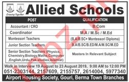 Allied School Berma Town Campus Islamabad, Pakistan seeks candidates for the posts of Accountant, CRO, Coordinator, Montessori Teacher, Teacher, Section Teacher, Physics Teacher, Chemistry Teacher, Biology Teacher, Maths Teacher, Computer Teacher, English Teacher, Urdu Teacher, Pak Studies Teacher.