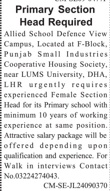 ALLIED SCHOOL Lahore, lahore Punjab Pakistan invites applications from eligible candidates for the post of teacher and primary section head as per advertisement of October 22, 2024 published in daily Jang Newspaper. Candidates with Master and Bachelor etc. educational background will be preferred.