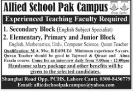 Qualified and experienced candidates for the posts of English Subject Specialist, Secondary Teacher, Elementary Teacher, Primary Teacher, English Teacher, Mathematics Teacher, Urdu Teacher, Computer Science Teacher and Quran Teacher required for Allied School Pak Campus.