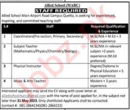 Vacant posts including art teacher, maths teacher, biology teacher, physical instructor, subject teacher, music teacher, chemistry teacher, physics teacher and coordinator are announced in Allied Schools Quetta, quetta Balochistan Pakistan as per 28 May 2023 advertisement in daily Jang Newspaper. Educational qualifications required Others, Bachelor, MA, M.sc and Master etc.