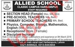 A well reputed Allied Schools Classic Campus Harbanspur is looking for Section Head, Pre School Teacher, Primary Teacher, Teacher, Physics Teacher, Computer Teacher, Biology Teacher, Mathematics Teachers, English Teacher, Receptionist, Discipline In-charge in Lahore.