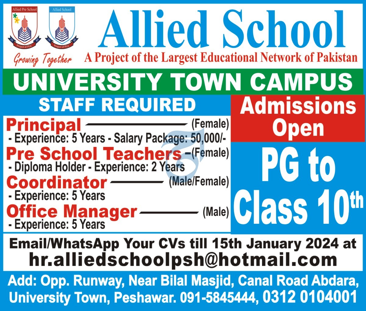 Allied Schools jobs advertisement dated about 12 January 2024 in daily Aaj Newspaper invites application for the vacant post of coordinator, pre school teacher, principal and office manager in Peshawar, peshawar Khyber Pakhtunkhwa KPK Pakistan. Educational qualifications required Master, M.sc, MA, B.ed, Bachelor and BA etc.