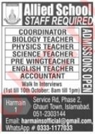 Allied Schools jobs advertisement dated about 30 September 2024 in daily Jang Newspaper invites application for the vacant post of pre wing teacher, physics teacher, science teacher, accountant, coordinator, english teacher and biology teacher in Islamabad, islamabad Islamabad Pakistan. MS, M.sc, MBA, Master, MA and Bachelor etc. educational qualification will be preferred.