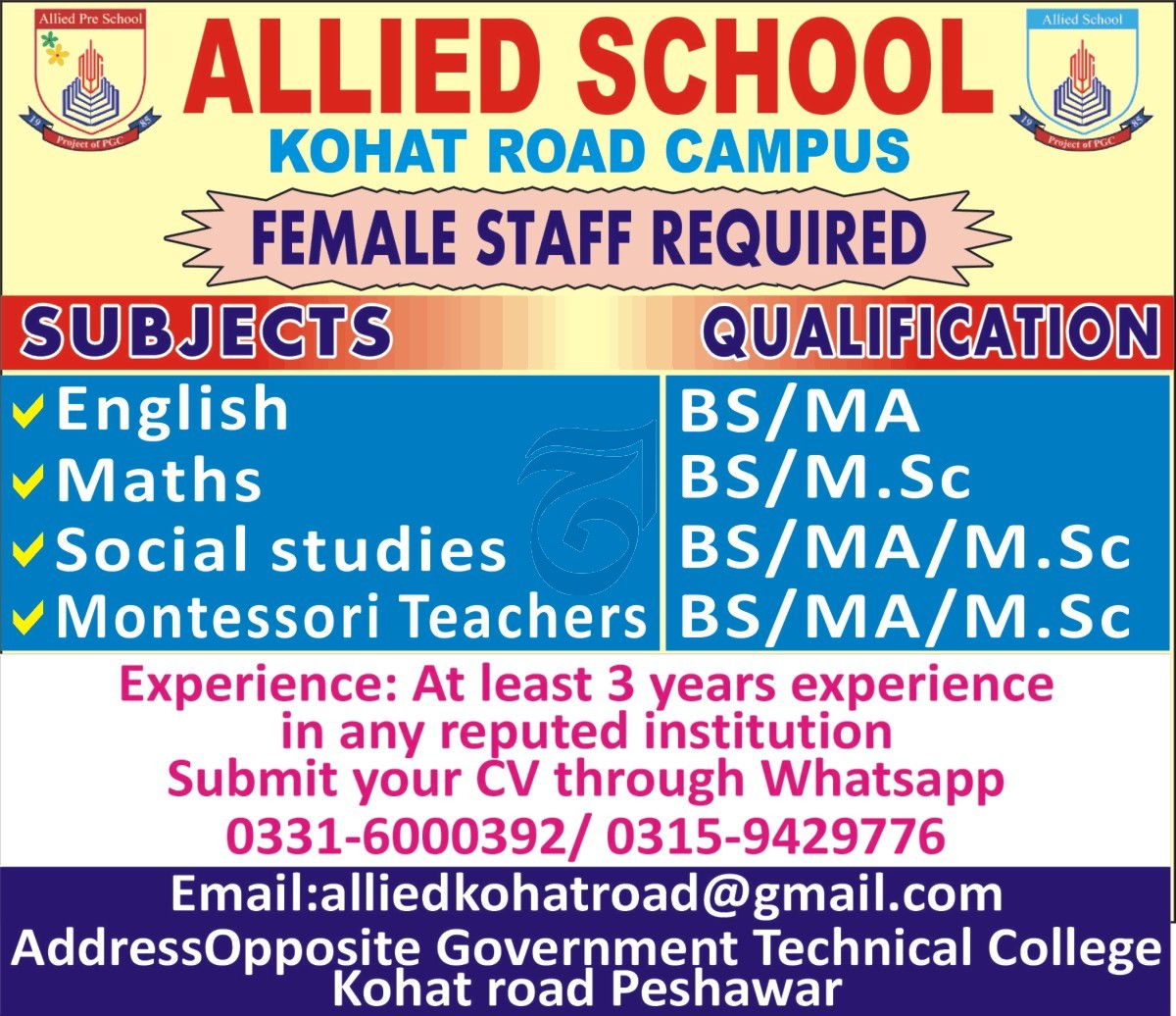 Allied Schools Peshawar, peshawar Khyber Pakhtunkhwa KPK Pakistan invites applications from eligible candidates for the post of maths teacher, english teacher, social studies teacher and montessori teacher as per advertisement of August 21, 2025 published in daily Aaj Newspaper. Preferred Education is Master, MS and Bachelor etc.