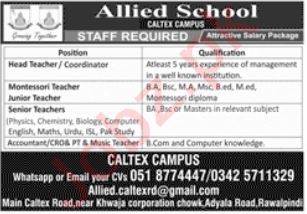 Vacant posts including teaching staff, coordinator, head teacher, music teacher, accountant and montessori teacher are announced in Allied Schools Rawalpindi, rawalpindi Punjab Pakistan as per 29 June 2025 advertisement in daily Jang Newspaper. Candidates with Master and Bachelor etc. educational background will be preferred.