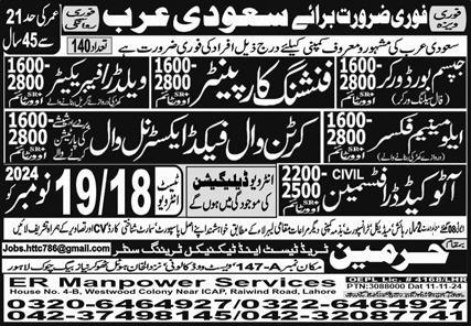 Harmain Trade Test & Technical Training Center latest Overseas Manufacturing jobs and others can be applied till November 19, 2024 or as per closing date in newspaper ad. Read complete ad online to know how to apply on latest Harmain Trade Test & Technical Training Center job opportunities. Salary varies from 206000. Earn more by overtime. Facilities like transport, medical and accommodation may be provided.