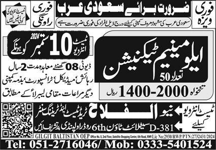 Vacant posts including aluminum technician are announced in New Al Falah Trade Test & Training Center Riyadh, dammam Saudi Arabia as per 6 September 2024 advertisement in daily Express Newspaper. Educational qualifications required DAE, Intermediate and Matric etc.