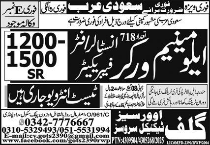 Gulf Overseas Technical Services Jeddah, jeddah Saudi Arabia invites applications from eligible candidates for the post of aluminium worker as per advertisement of December 14, 2025 published in daily Express Newspaper. Preferred Education is Intermediate and Matric etc.