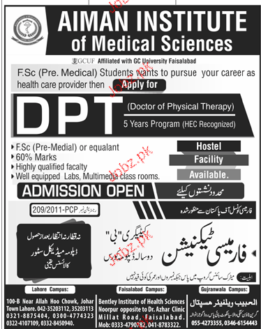 Aman Institute of Medical Science Admission in DPT Doctor of Physicsl Therapy Fice Year Program HEC Recognized and Pharmacy Technicians Two Year Program in Gujranwala. Read newspaper ad for exact details.