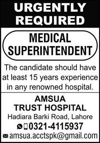 Vacant posts including medical superintendent are announced in AMSUA Trust Hospital Barki Road Lahore, lahore Punjab Pakistan as per 10 March 2025 advertisement in daily Express Newspaper. Persons with Bachelor, Master and MS etc. education can apply.