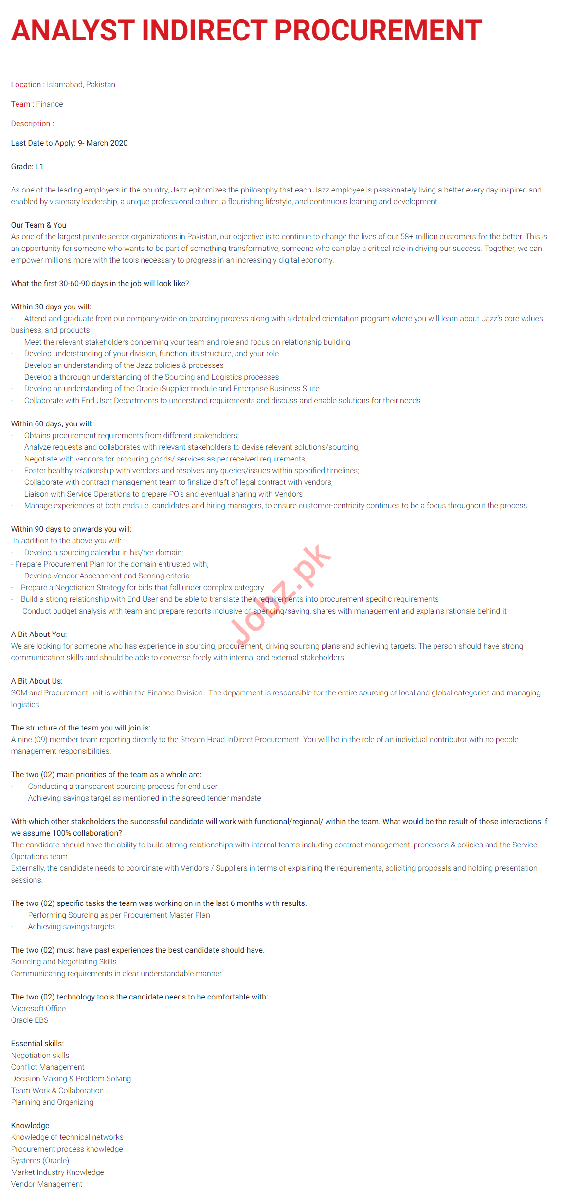 Latest Jazz Telecom Finance Posts Islamabad 2025