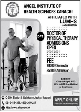 Angel Institute of Health Sciences Karachi affiliated with Liaquat University of Medical & Health Sciences LUHMS Jamshoro has announced admission in Doctor of Physical Therapy DPT. Read newspaper ad for exact details.