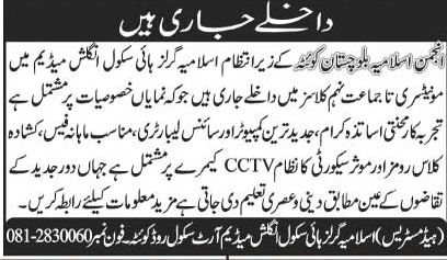 Anjuman Islamia Balochistan Quetta Admission in Montessori to IX in English Medium Art School Road Quetta. Admission Session 2018-2019. Admission Open for Both Male / Female Students. Read newspaper ad for exact details.