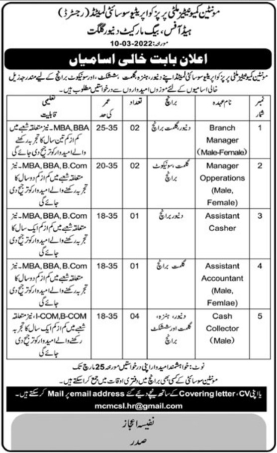 Mountain Communities Multi Purpose Cooperative Society Gilgit, gilgit and hunza Gilgit Baltistan Pakistan invites applications from eligible candidates for the post of male cash collector, manager operations, branch manager, assistant cashier and assistant accountant as per advertisement of March 11, 2022 published in daily Ausaf Newspaper. Candidates with BBA, B.com, MBA and I.com etc. educational background will be preferred.