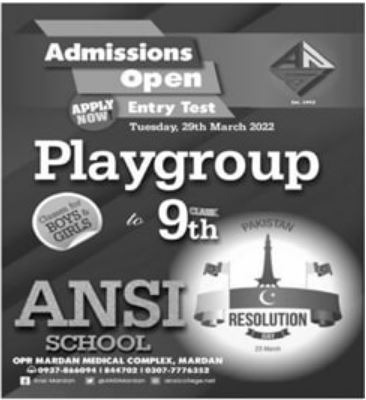 Admissions in Ansi School & College 2022 for Play Group PG to Matric has been announced. Eligible students who qualify as per admission criteria in Ansi School & College Mardan Khyber Pakhtunkhwa KPK Pakistan can apply in Other School for academic year 2022. Students for admissions in Matric, Primary and Middle can apply for online or campus classes as per Private institute criteria till admission closing date April 25, 2022. Read newspaper ad for exact details.