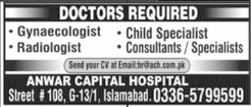 Anwar Capital Hospital is looking for candidates for following posts as per job advertisement published in daily Jang Newspaper of August 17, 2025 for location G-13/1 Islamabad, islamabad Islamabad Pakistan: