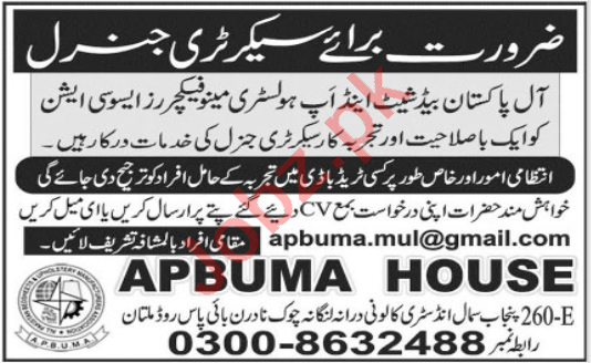 Vacancies in All Pakistan Bedsheets & Upholstery Manufacturers Association APBUMA Advertisement August 2020