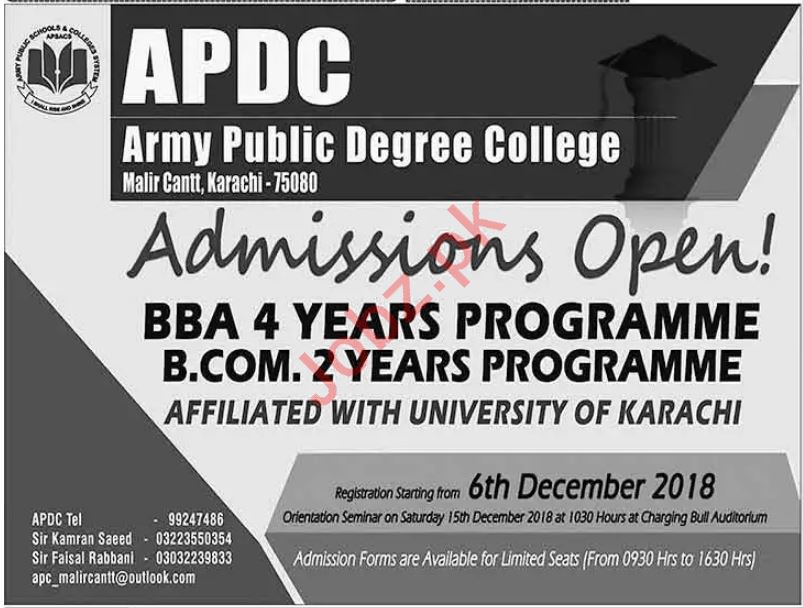 APDC Army Public Degree College, Malir Cantt Karachi, Pakistan Army, Pakistan are opened admissions spring 2019 for the classes of BBA 4 Years & B Com 2 Years. Read newspaper ad for exact details.