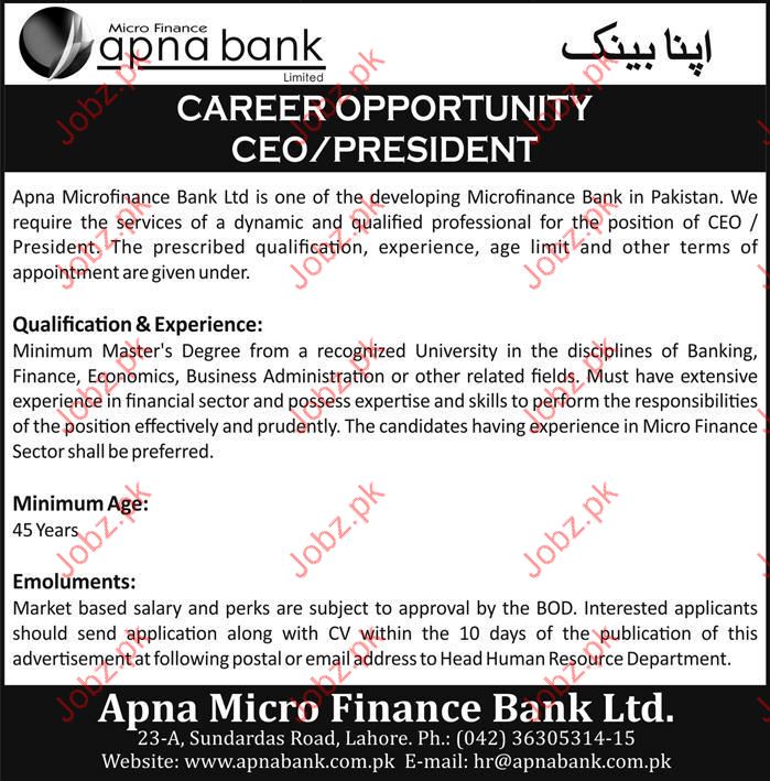 Apply as per details in job advertisement. Login to view further details of how to apply via https://www.jobz.pk online.