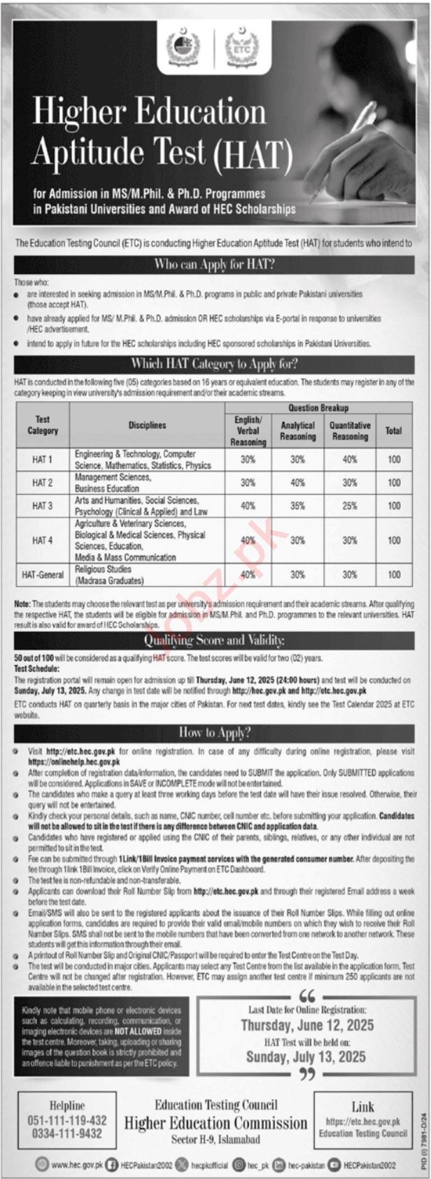 Higher Education Commission HEC H-9 Islamabad, islamabad Islamabad Pakistan invites applications from eligible candidates for the post of hec aptitude test as per advertisement of May 18, 2025 published in daily Jang Newspaper. Educational qualifications required Bachelor and Master etc.