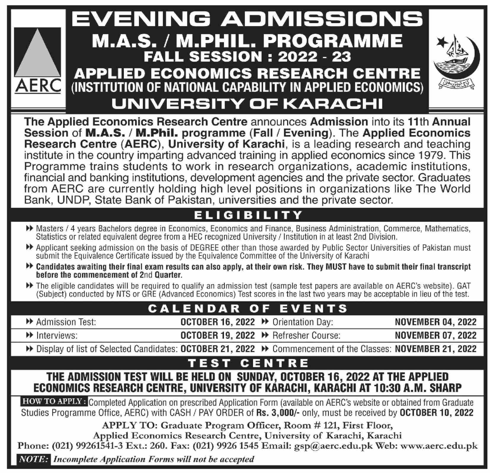 Applied Economics Research Centre AERC, University of Karachi UoK MAS & Mphil Program admissions 2022 has been announced. Eligible students who qualify as per admission criteria in Applied Economics Research Centre Karachi Sindh Pakistan can apply in Science University for academic year 2022. Students for admissions in Mphil & criteria can apply as per Government institute admission policy 2022 before closing date October 10, 2022 as per advertisement. Read newspaper ad for exact details.