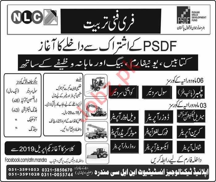 Applied Technologies Institute NLC Mandra District Rawalpindi, Pakistan are started admissions spring 2019 for the classes of Plumber, Civil Surveyor, Quantity Surveyor, Crane Operator etc. Read newspaper ad for exact details.