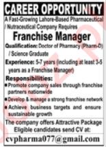 Pharmaceutical Company Lahore, lahore Punjab Pakistan invites applications from eligible candidates for the post of franchise manager as per advertisement of November 17, 2025 published in daily Jang Newspaper. Pharma D etc. educational qualification will be preferred.