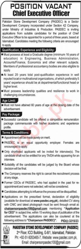 Pakistan Stone Development Company Islamabad, islamabad Islamabad Pakistan invites applications from eligible candidates for the post of chief executive officer as per advertisement of November 27, 2023 published in daily Jang Newspaper. Educational qualifications required Master, Bachelor, MBA and BBA etc.