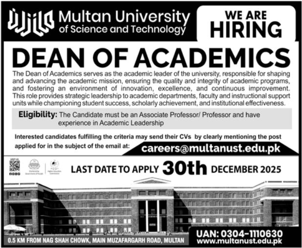 Multan University of Science & Technology jobs advertisement dated about 17 December 2025 in daily Jang Newspaper invites application for the vacant post of dean of academics in Multan, multan Punjab Pakistan. Preferred Education is Phd, MS, Mphil and Others etc.