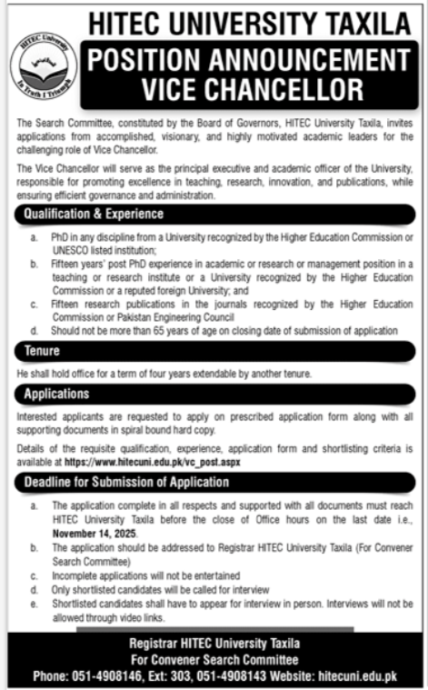 Vacancies in HiTec University Taxila Advertisement October 2025