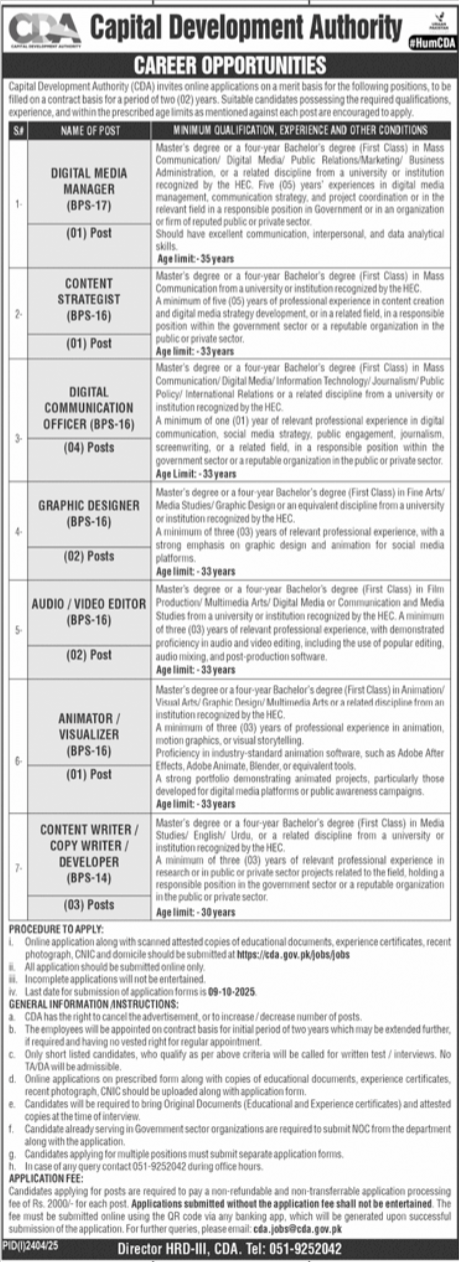 Vacant posts including Animator, Content Strategist, Digital Media Manager, Developer, Copy Writer, Audio Editor, Graphic Designer, Digital Communication Officer, Content Writer and Video Editor are announced in Capital Development Authority CDA G-7/4 Islamabad, islamabad Islamabad Pakistan as per 22 September 2025 advertisement in daily Jang Newspaper. Candidates with Bachelor and Master etc. educational background will be preferred.