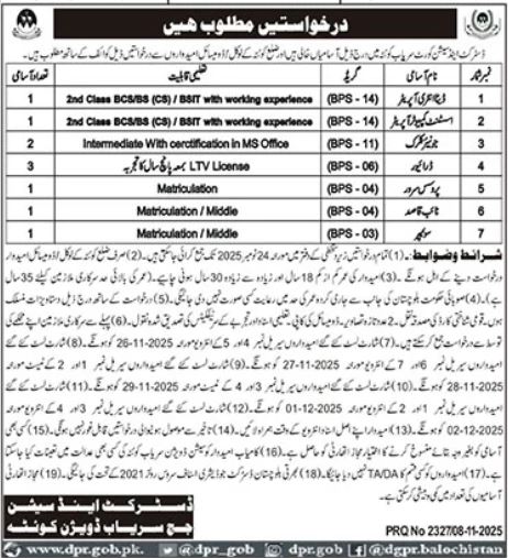 Vacant posts including data entry operator, sweeper, process server, driver, assistant computer operator, jr clerk and naib qasid are announced in District and Session Judge Quetta, quetta Balochistan Pakistan as per 10 November 2025 advertisement in daily Jang Newspaper. Educational qualifications required Intermediate, Matric, Middle and Bachelor etc.