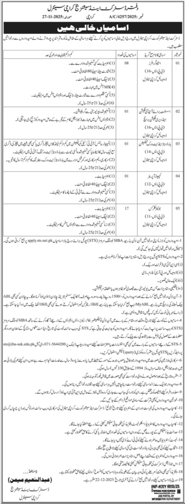 Office of the District & Session Judge jobs advertisement dated about 7 December 2025 in daily Jang Newspaper invites application for the vacant post of hardware network technician, stenographers, computer operator, jr clerks and assistant in Karachi, karachi Sindh Pakistan. Educational qualifications required Bachelor and Intermediate etc.